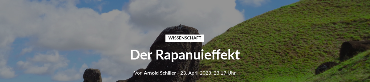 Mauro Bologna und Gerardo Aquino haben dieses Szenario im Kopf, wenn sie in ihrer Arbeit nature.com/articles/s4159 davon sprechen und der Menschheit lediglich 10% Überlebenswahrscheinlichkeit zusprechen. Allerdings setzen die Autoren den Point of no Return zum Untergang weit später an. Der Planet Erde ist dabei dann quasi als die Osterinsel im Pazifik zu verstehen. Abgeschnitten von anderen Kulturen und Resourcen auf sich alleine gestellt und die Rapa Nui sind die gesamte Menschheit. Was ich an den oberen 1% und reichsten Teil der Weltbevölkerung nicht ganz verstehe, dass diese ihr Verhalten nicht ändern. Sollte der Rapanuieffekt bzw. das Osterinselszenario tatsächlich eintreten, wären sie nämlich die ersten, die sterben werden. Das ist nämlich dann eine